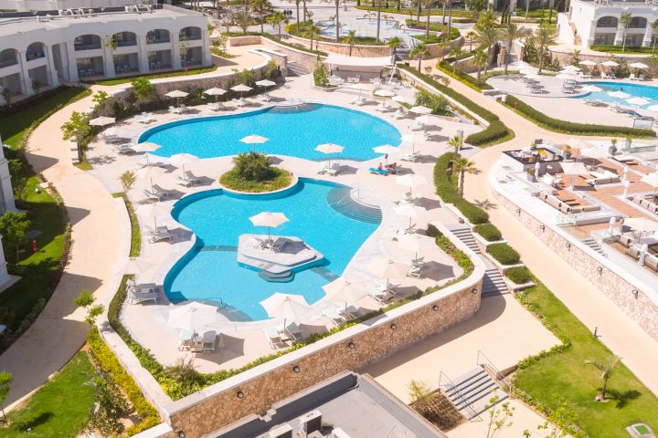 bazén Waves pre celú rodinu • sezónne vyhrievaný bazén s animačným tímom • relaxačný bazén 640 m² s plytkou a hlbokou časťou, oddychovou zónou a záhradou s hojdacími sieťami, • bazén Infinity 700 m² vrátane oddychovej zóny Gazebo • bazén Private Villas 1440 m²