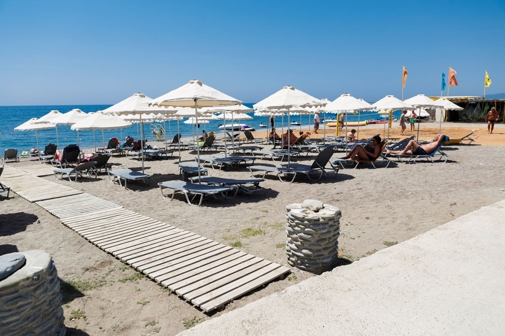 piesočnato – štrková pláž v stredisku Kiotari, slnečníky a lehátka zdarma