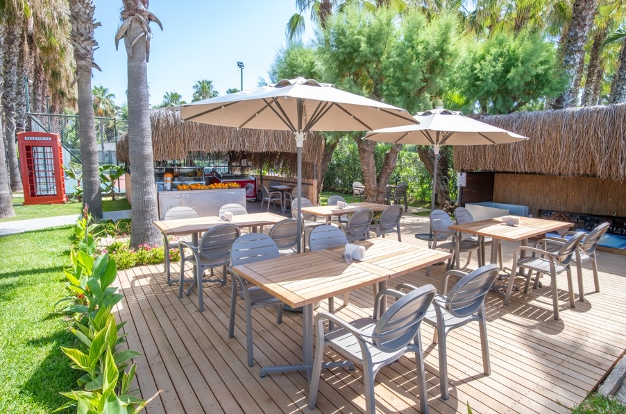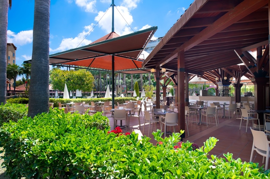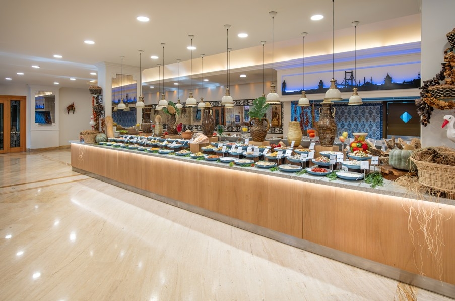 raňajky, neskoré raňajky, obedy, večere, neskorá večera formou bufetových stolov • popoludňajší snack formou bufetu v plážovom bare a v bare pri bazéne • káva, čaj, koláče, zmrzlina počas dňa vo vybratých baroch • gözleme stánok • cukráreň (11:00-19:00 h) • miestne alkoholické, nealkoholické a niektoré importované nápoje v určenom čase (VS koňaky, whiskey, rum, energy drinky) v niektorom z barov 24 h