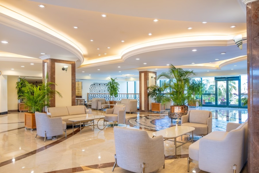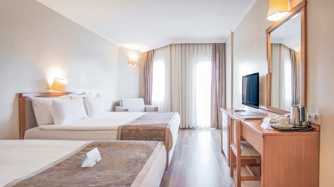 celkom 319 izieb • vstupná hala s recepciou • Wi-Fi v celom hoteli zdarma • hlavná reštaurácia • 1 à la carte reštaurácia • 4 bary • fitnes • vonkajšie bazény • tobogány (denne 10:00-12:00 a 14:00-16:30 h) • TV miestnosť • herňa • playstation • animácie • stolný tenis • šípky • šach • boccia • tenisové kurty • zumba • vodný aerobik • plážový volejbal • streľba zo vzduchovky • detský kočiar ( na vyžiadanie) • za poplatok: procedúry wellness centra, hammam kúpele, kozmetické procedúry, biliard, vodné športy, doktor, kaderník, optik