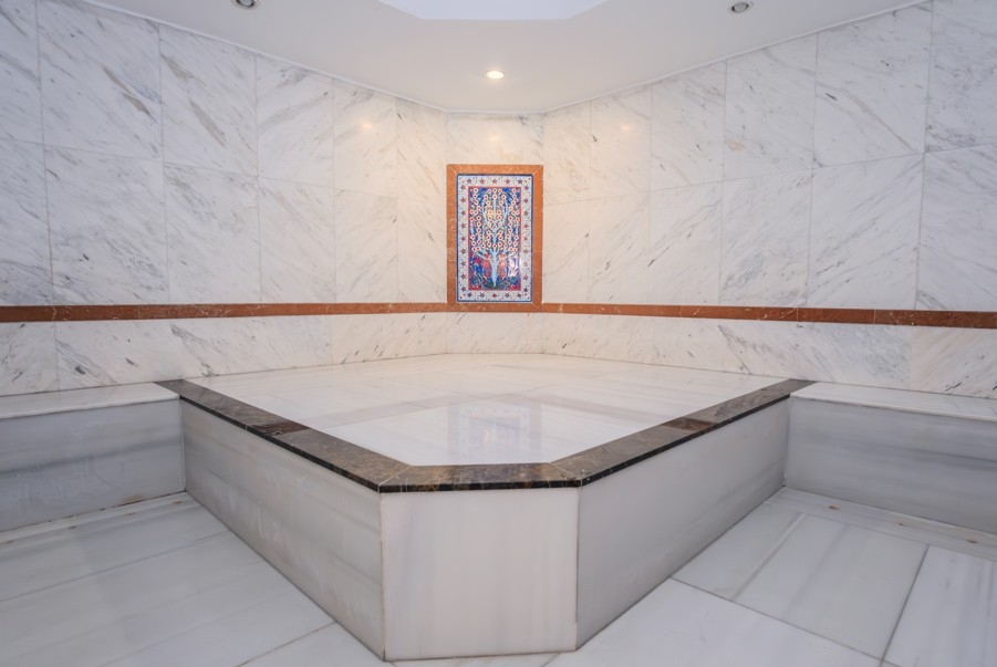 turecký kúpeľ (zdarma) • parný kúpeľ (zdrama) • ajurvédske procedúry, hamam, masáže, procedúry SPA a kozmetického centra (za poplatok)