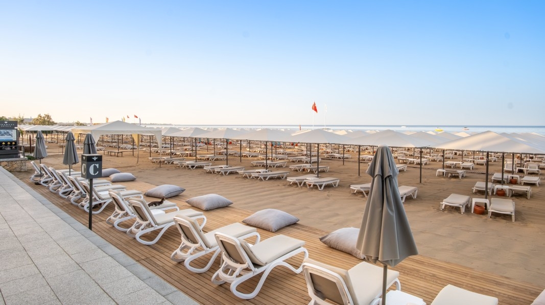 široká piesočnatá pláž • pozvoľný vstup do mora • slnečníky, ležadlá, plážové osušky na pláži a pri bazénoch zdarma • vodné športy za poplatok • plážový bar