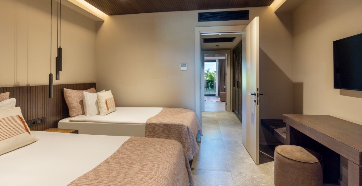 Rodinná izba s výhľadom do záhrady (52 m2, 2 spálne, 1. spálňa s manželskou posteľou a 2. spálňa s 2 oddelenými lôžkami, pohovka, výhľad do záhrady, balkón alebo terasa, max. 2 dospelé osoby a 2 deti alebo 3 dospelé osoby a 1 dieťa)